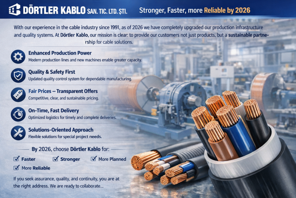 Dörtler Kablo olarak vizyonumuz; yüksek kaliteli, yenilikçi ve sürdürülebilir kablo çözümleriyle global pazarda güvenilir bir referans marka olmaktır. 1991 yılından bu yana edindiğimiz 34 yıllık tecrübeyle; yalnızca ürün değil, mühendislik, güven ve uzun vadeli iş birlikleri sunan bir yapı kurduk.
