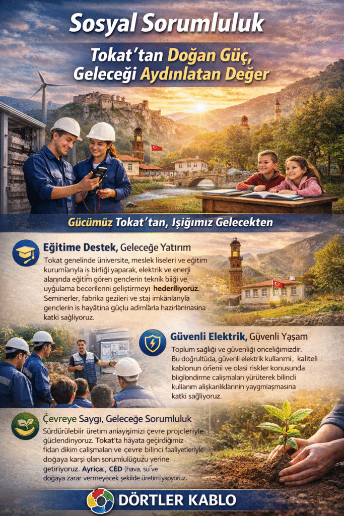Dörtler Kablo olarak, 1991 yılından bu yana sürdürdüğümüz üretim gücümüzü yalnızca sanayiye değil, topluma ve geleceğe de değer katmak için kullanıyoruz.Kökenlerimizin bulunduğu Tokat ilinde, eğitimden çevreye, gençlerden toplumsal bilinçlendirmeye uzanan sosyal sorumluluk projeleriyle sürdürülebilir bir gelecek için çalışıyoruz.